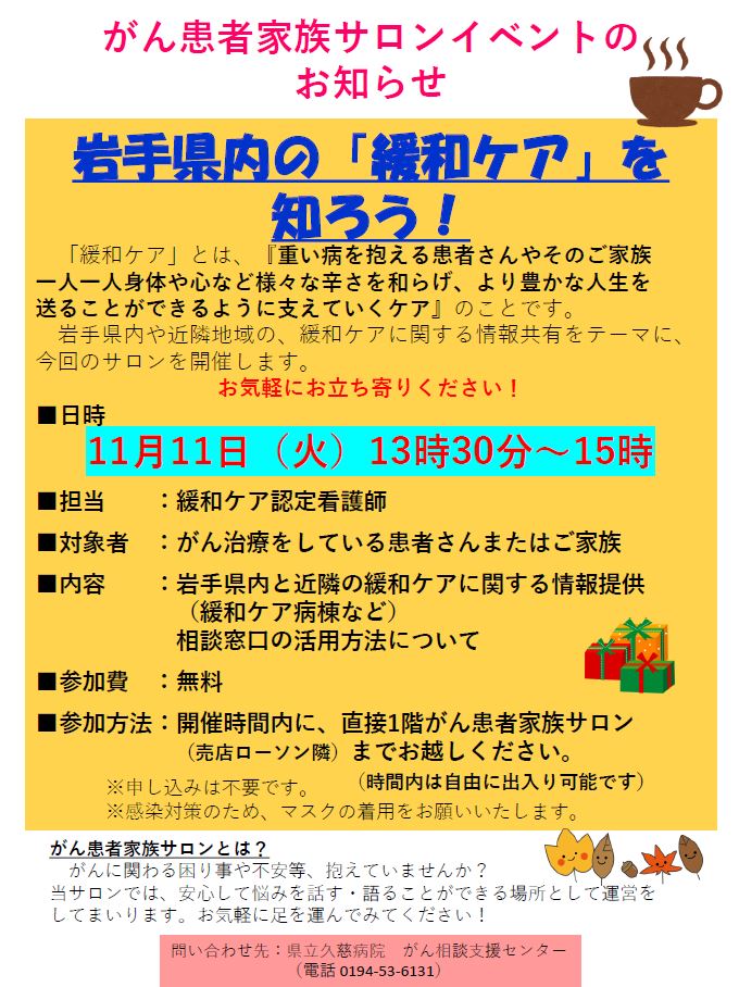 『岩手県内の「緩和ケア」を知ろう!』の開催について(がん患者家族サロン イベント)