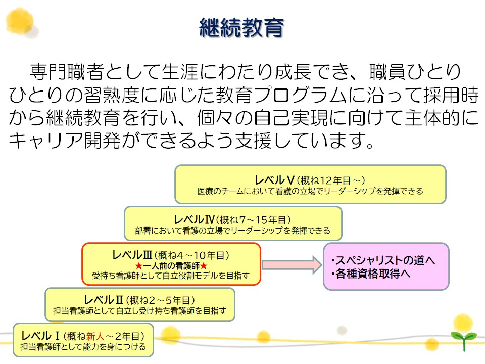 - 認定看護師、特定行為看護師など資格認定を取得できる体制を整えています。