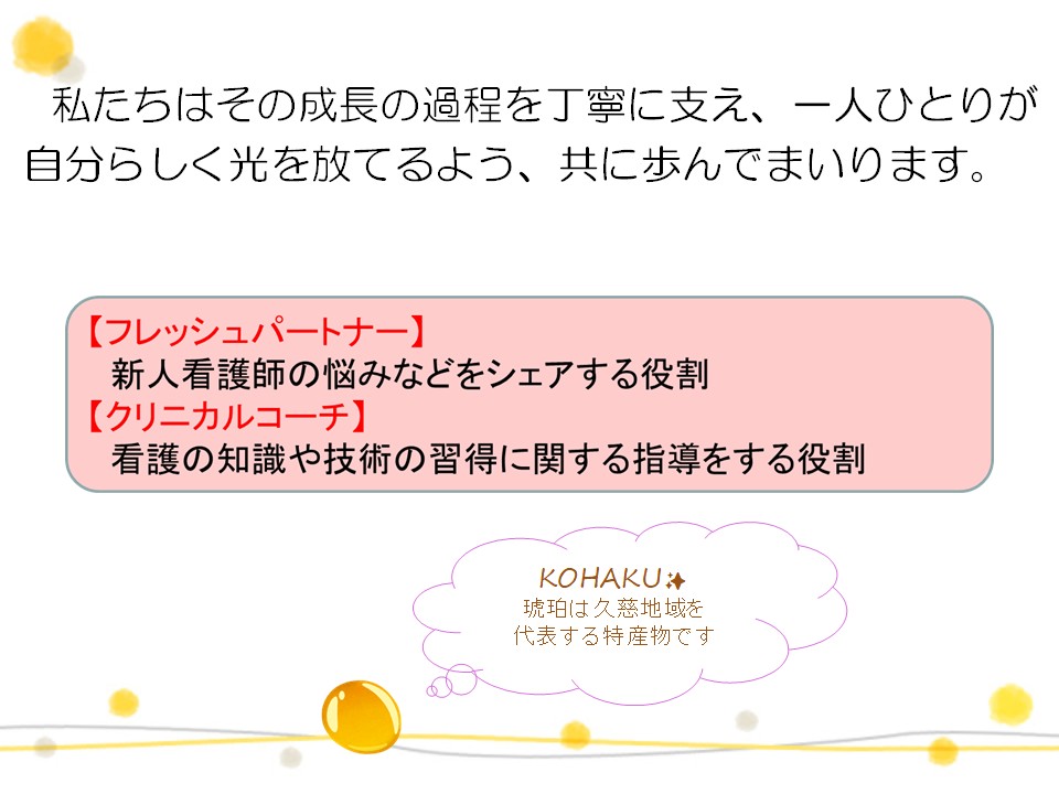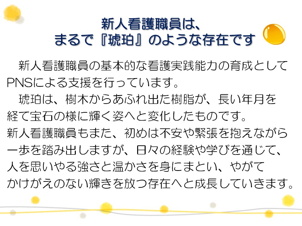 - PNS(パートナーシップ・ナーシング・システム)における新人看護師支援体制を取り入れ、新人看護師が安心して職場になじめるように配慮しています。育児休暇明けの看護師やブランクがある中途採用者も同様の支援体制をとっていますので安心できる環境です。